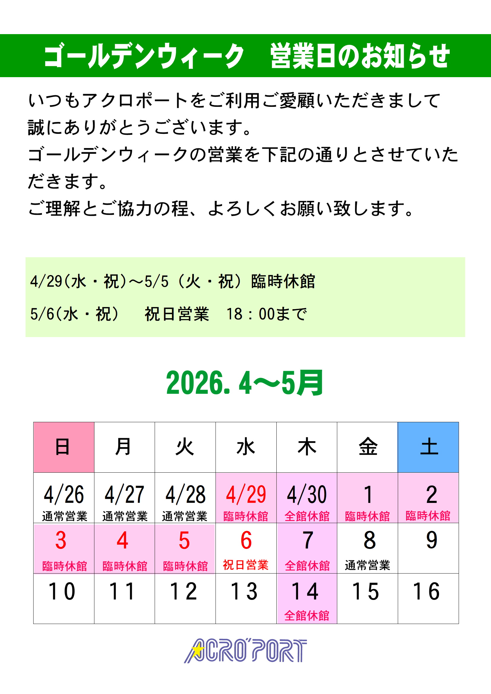 フィットネス:ゴールデンウィーク 営業日のお知らせ